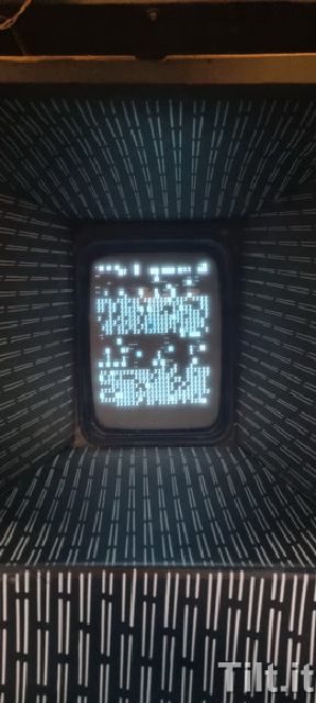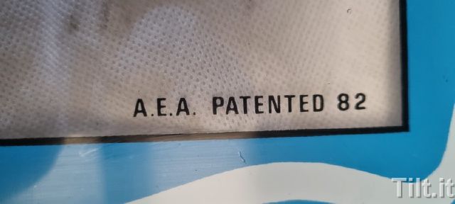 Il mobile e’ particolare, la plancia si trova molto in alto, almeno 20cm piu’ in alto di quella di un normale mobile da videogiochi del periodo (guardate lo spazio tra il lato alto dello sportello gettoniera, e la plancia…). Provando ad accendere ovviamente il gioco non funziona, questo pero’ ci permette di vedere che guardando (non senza fatica vista l’altezza) dentro al vetro, stiamo osservando uno specchio posizionato a 45°, ed il TV e’ in fondo in basso, vicino ai nostri piedi. Un trucco del genere era usato nei vecchi giochi di tiro con il fucile, per dare una impressione di profondita’. Qui in piu’ lo schermo TV e’ pure piccolo, sembra un 14″, quindi pare ancora piu’ lontano di quello che in realta’ e’. La plancia ha un joystick che a muoverlo sembra quantomeno a 16 posizioni, con un pulsantino rosso installato in cima, e nessun altro pulsante in giro a parte quelli dello start, uno o due giocatori (supponiamo alternati, visto che c’e’ un joystick solo).