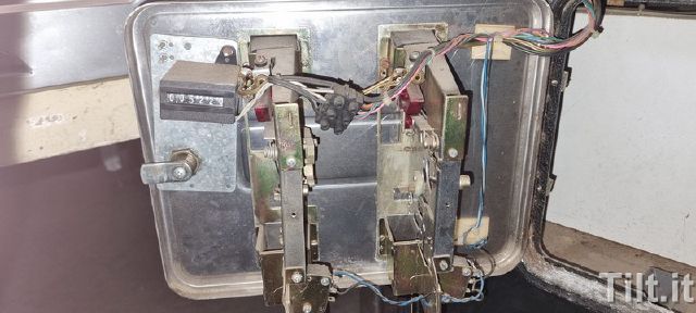 Aprendo lo sportello, troviamo il solito contatore meccanico del totale partite giocate, e come avevamo immaginato leggendo del biri-biri, c’e’ anche un secondo contatore sempre meccanico, pero’ azzerabile, infilato nel legno che separa la zona cassetta monete con quella della scheda e del tv. Il noleggiatore fa i suoi conteggi, vede quanti premi il barista ha pagato ai giocatori, ed azzera il contatore, evitando cosi’ di dover lasciare foglietti con i conteggi in giro ogni volta. Ormai e’ chiaro che non e’ un semplice videogioco, ma piu’ uno di quegli apparecchi a tempo che permettevano appunto di vincere un premio. Magari e’ stato costruito cosi’ alto per renderlo anche poco appetibile ai ragazzini, chissa’.