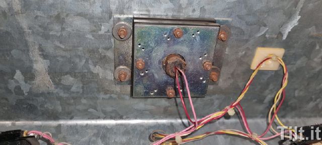 Apriamo la plancia, ed ecco una sorpresa: il joystick e’ finto, l’unica cosa collegata e’ il pulsantino in cima. Quindi e’ totalmente inutile muovere la leva nelle sue direzioni, non ci sono lamelle o micro che ne rilevano il movimento. La placca di supporto ha diversi fori, la predisposizione per i micro, immaginiamo, ma non sono usati in questo gioco.