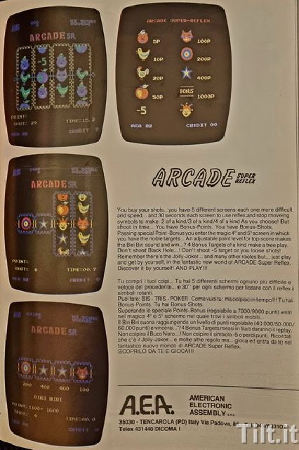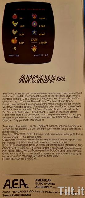 Esaminando i volantini pubblicitari dell’epoca che abbiamo in archivio, per questo “Arcade Super Reflex” sono menzionate le varie combinazioni, descritte come se fosse un gioco di carte; anzi, si cita proprio il termine “poker” il che, per quegli anni, era sicuramente audace.